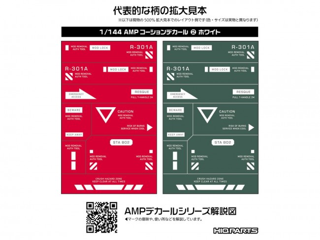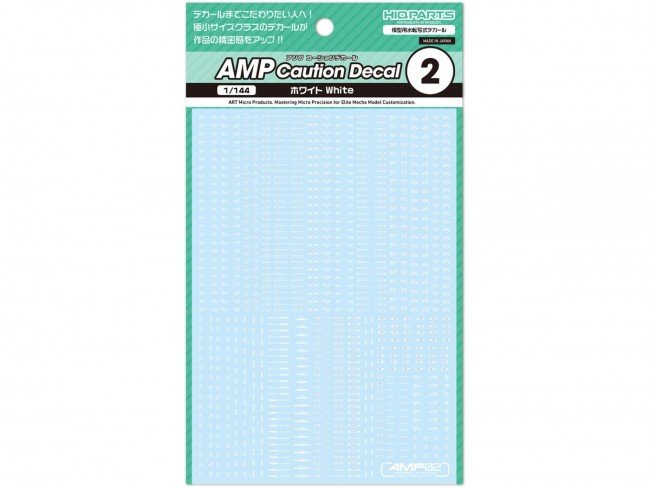 デカールまでこだわりたい人へ! 極小サイズクラスのデカールが作品の精密感をアップ!! メカモデル向けの水転写式汎用コーションデカール「AMP」は、近年の細分化されたメカモデルのパーツ割に対応するため、デザインを刷新した新シリーズです。 装飾を削ぎ落としたスタンダードなデザインが中心で、作品の精密感と情報量を高めます。 ある程度の可読性を確保しているため、ブログの文字解説を参考に、最適な貼り付け場所を選定してください。 極小サイズながらも高精細な印刷が施されており、モデルのスケール感を損なうことなく細部を彩り、模型の持つ魅力を最大限に引き立てます。 また、光沢仕上げの際にクリアコート層の濁りが目立ちにくい「研ぎ出し対応」のグロスデカールです。 AMPコーションデカール01: 「01」は汎用性が高く、使用頻度の高い柄を多く収録しています。 AMPコーションデカール02: 「02」は汎用性が高く、かつアクセントが大きい柄を多く収録しています。 「01」と合わせて使います。 AMPコーションデカール03: 「03」は中型と長文のマークを収録。 「01」、「02」と合わせて使用します。 AMPコーションデカール04: 「04」は大型と数字入り、長文のマークを収録。「01」、「02」、「03」と合わせて使用します。 デカールの文字やデザインの解説記事はこちらで公開しています。 https://hiqparts.info/amp-ref 水転写式デカール サイズ/110mm x 156mm 生産国/日本製