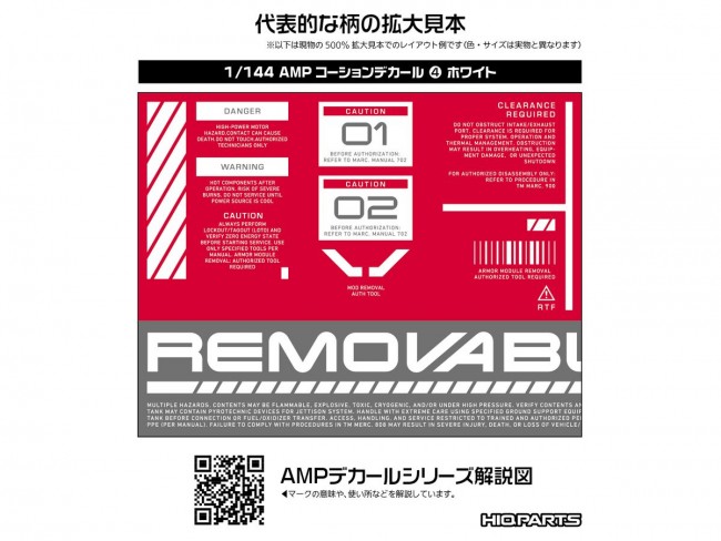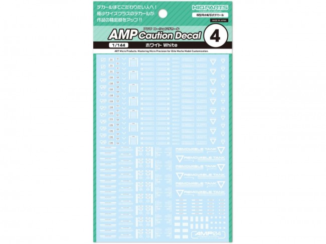デカールまでこだわりたい人へ! 極小サイズクラスのデカールが作品の精密感をアップ!!   メカモデル向けの水転写式汎用コーションデカール「AMP」は、近年の細分化されたメカモデルのパーツ割に対応するため、デザインを刷新した新シリーズです。 装飾を削ぎ落としたスタンダードなデザインが中心で、作品の精密感と情報量を高めます。 ある程度の可読性を確保しているため、ブログの文字解説を参考に、最適な貼り付け場所を選定してください。  極小サイズながらも高精細な印刷が施されており、モデルのスケール感を損なうことなく細部を彩り、模型の持つ魅力を最大限に引き立てます。 また、光沢仕上げの際にクリアコート層の濁りが目立ちにくい「研ぎ出し対応」のグロスデカールです。  AMPコーションデカール01: 「01」は汎用性が高く、使用頻度の高い柄を多く収録しています。  AMPコーションデカール02: 「02」は汎用性が高く、かつアクセントが大きい柄を多く収録しています。 「01」と合わせて使います。  AMPコーションデカール03: 「03」は中型と長文のマークを収録。 「01」、「02」と合わせて使用します。  AMPコーションデカール04: 「04」は大型と数字入り、長文のマークを収録。「01」、「02」、「03」と合わせて使用します。  デカールの文字やデザインの解説記事はこちらで公開しています。 https://hiqparts.info/amp-ref  水転写式デカール サイズ/110mm x 156mm 生産国/日本製