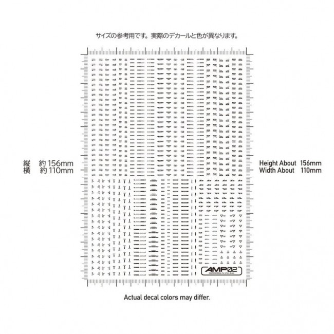 デカールまでこだわりたい人へ! 極小サイズクラスのデカールが作品の精密感をアップ!! メカモデル向けの水転写式汎用コーションデカール「AMP」は、近年の細分化されたメカモデルのパーツ割に対応するため、デザインを刷新した新シリーズです。 装飾を削ぎ落としたスタンダードなデザインが中心で、作品の精密感と情報量を高めます。 ある程度の可読性を確保しているため、ブログの文字解説を参考に、最適な貼り付け場所を選定してください。 極小サイズながらも高精細な印刷が施されており、モデルのスケール感を損なうことなく細部を彩り、模型の持つ魅力を最大限に引き立てます。 また、光沢仕上げの際にクリアコート層の濁りが目立ちにくい「研ぎ出し対応」のグロスデカールです。 ・水転写式デカール サイズ/110mm x 156mm ・生産国/日本製 ●AMPコーションデカール02 ・「02」は汎用性が高く、かつアクセントが大きい柄を多く収録しています。「01」と合わせて使います。