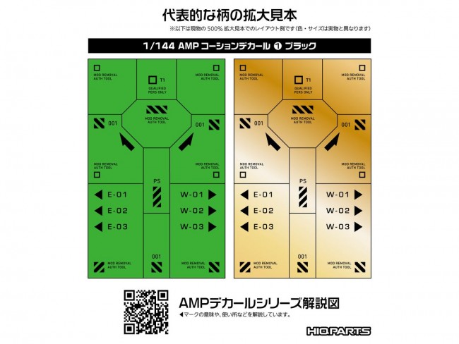 デカールまでこだわりたい人へ! 極小サイズクラスのデカールが作品の精密感をアップ!! メカモデル向けの水転写式汎用コーションデカール「AMP」は、近年の細分化されたメカモデルのパーツ割に対応するため、デザインを刷新した新シリーズです。 装飾を削ぎ落としたスタンダードなデザインが中心で、作品の精密感と情報量を高めます。 ある程度の可読性を確保しているため、ブログの文字解説を参考に、最適な貼り付け場所を選定してください。 極小サイズながらも高精細な印刷が施されており、モデルのスケール感を損なうことなく細部を彩り、模型の持つ魅力を最大限に引き立てます。 また、光沢仕上げの際にクリアコート層の濁りが目立ちにくい「研ぎ出し対応」のグロスデカールです。 「01」は汎用性が高く、使用頻度の高い柄を多く収録しています。