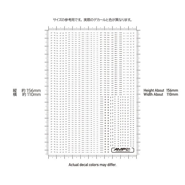 デカールまでこだわりたい人へ! 極小サイズクラスのデカールが作品の精密感をアップ!! メカモデル向けの水転写式汎用コーションデカール「AMP」は、近年の細分化されたメカモデルのパーツ割に対応するため、デザインを刷新した新シリーズです。 装飾を削ぎ落としたスタンダードなデザインが中心で、作品の精密感と情報量を高めます。 ある程度の可読性を確保しているため、ブログの文字解説を参考に、最適な貼り付け場所を選定してください。 極小サイズながらも高精細な印刷が施されており、モデルのスケール感を損なうことなく細部を彩り、模型の持つ魅力を最大限に引き立てます。 また、光沢仕上げの際にクリアコート層の濁りが目立ちにくい「研ぎ出し対応」のグロスデカールです。 ・水転写式デカール サイズ/110mm x 156mm ・生産国/日本製 ●AMPコーションデカール01 ・「01」は汎用性が高く、使用頻度の高い柄を多く収録しています。