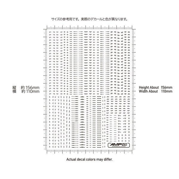 デカールまでこだわりたい人へ! 極小サイズクラスのデカールが作品の精密感をアップ!! メカモデル向けの水転写式汎用コーションデカール「AMP」は、近年の細分化されたメカモデルのパーツ割に対応するため、デザインを刷新した新シリーズです。 装飾を削ぎ落としたスタンダードなデザインが中心で、作品の精密感と情報量を高めます。 ある程度の可読性を確保しているため、ブログの文字解説を参考に、最適な貼り付け場所を選定してください。 極小サイズながらも高精細な印刷が施されており、モデルのスケール感を損なうことなく細部を彩り、模型の持つ魅力を最大限に引き立てます。 また、光沢仕上げの際にクリアコート層の濁りが目立ちにくい「研ぎ出し対応」のグロスデカールです。 ・水転写式デカール サイズ/110mm x 156mm ・生産国/日本製 ●AMPコーションデカール02 ・「02」は汎用性が高く、かつアクセントが大きい柄を多く収録しています。「01」と合わせて使います。
