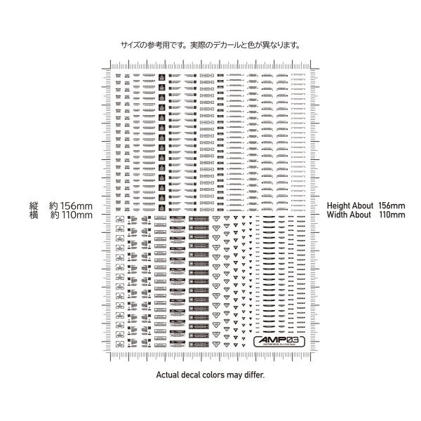 デカールまでこだわりたい人へ! 極小サイズクラスのデカールが作品の精密感をアップ!! メカモデル向けの水転写式汎用コーションデカール「AMP」は、近年の細分化されたメカモデルのパーツ割に対応するため、デザインを刷新した新シリーズです。 装飾を削ぎ落としたスタンダードなデザインが中心で、作品の精密感と情報量を高めます。 ある程度の可読性を確保しているため、ブログの文字解説を参考に、最適な貼り付け場所を選定してください。 極小サイズながらも高精細な印刷が施されており、モデルのスケール感を損なうことなく細部を彩り、模型の持つ魅力を最大限に引き立てます。 また、光沢仕上げの際にクリアコート層の濁りが目立ちにくい「研ぎ出し対応」のグロスデカールです。 ・水転写式デカール サイズ/110mm x 156mm ・生産国/日本製 ●AMPコーションデカール03 ・「03」は中型と長文のマークを収録。「01」、「02」と合わせて使用します。