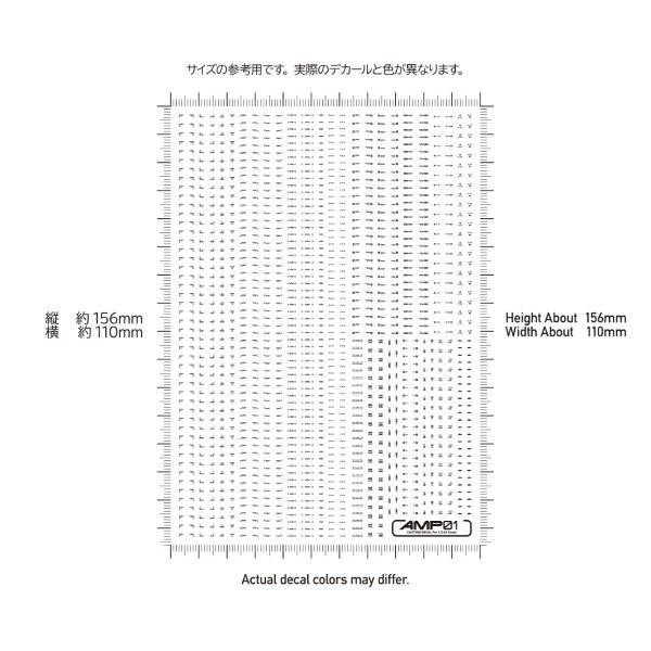 デカールまでこだわりたい人へ! 極小サイズクラスのデカールが作品の精密感をアップ!! メカモデル向けの水転写式汎用コーションデカール「AMP」は、近年の細分化されたメカモデルのパーツ割に対応するため、デザインを刷新した新シリーズです。装飾を削ぎ落としたスタンダードなデザインが中心で、作品の精密感と情報量を高めます。ある程度の可読性を確保しているため、ブログの文字解説を参考に、最適な貼り付け場所を選定してください。 極小サイズながらも高精細な印刷が施されており、モデルのスケール感を損なうことなく細部を彩り、模型の持つ魅力を最大限に引き立てます。また、光沢仕上げの際にクリアコート層の濁りが目立ちにくい「研ぎ出し対応」のグロスデカールです。 AMPコーションデカール01 「01」は汎用性が高く、使用頻度の高い柄を多く収録しています。 水転写式デカール サイズ/110mm x 156mm 生産国/日本製