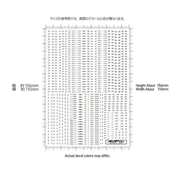 デカールまでこだわりたい人へ! 極小サイズクラスのデカールが作品の精密感をアップ!! メカモデル向けの水転写式汎用コーションデカール「AMP」は、近年の細分化されたメカモデルのパーツ割に対応するため、デザインを刷新した新シリーズです。装飾を削ぎ落としたスタンダードなデザインが中心で、作品の精密感と情報量を高めます。ある程度の可読性を確保しているため、ブログの文字解説を参考に、最適な貼り付け場所を選定してください。 極小サイズながらも高精細な印刷が施されており、モデルのスケール感を損なうことなく細部を彩り、模型の持つ魅力を最大限に引き立てます。また、光沢仕上げの際にクリアコート層の濁りが目立ちにくい「研ぎ出し対応」のグロスデカールです。 AMPコーションデカール02 「02」は汎用性が高く、かつアクセントが大きい柄を多く収録しています。「01」と合わせて使います。 水転写式デカール サイズ/110mm x 156mm 生産国/日本製