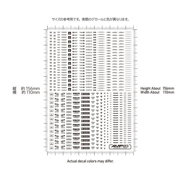 デカールまでこだわりたい人へ! 極小サイズクラスのデカールが作品の精密感をアップ!! メカモデル向けの水転写式汎用コーションデカール「AMP」は、近年の細分化されたメカモデルのパーツ割に対応するため、デザインを刷新した新シリーズです。装飾を削ぎ落としたスタンダードなデザインが中心で、作品の精密感と情報量を高めます。ある程度の可読性を確保しているため、ブログの文字解説を参考に、最適な貼り付け場所を選定してください。 極小サイズながらも高精細な印刷が施されており、モデルのスケール感を損なうことなく細部を彩り、模型の持つ魅力を最大限に引き立てます。また、光沢仕上げの際にクリアコート層の濁りが目立ちにくい「研ぎ出し対応」のグロスデカールです。 AMPコーションデカール03 「03」は中型と長文のマークを収録。「01」、「02」と合わせて使用します。 水転写式デカール サイズ/110mm x 156mm 生産国/日本製