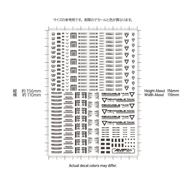 デカールまでこだわりたい人へ! 極小サイズクラスのデカールが作品の精密感をアップ!! メカモデル向けの水転写式汎用コーションデカール「AMP」は、近年の細分化されたメカモデルのパーツ割に対応するため、デザインを刷新した新シリーズです。装飾を削ぎ落としたスタンダードなデザインが中心で、作品の精密感と情報量を高めます。ある程度の可読性を確保しているため、ブログの文字解説を参考に、最適な貼り付け場所を選定してください。 極小サイズながらも高精細な印刷が施されており、モデルのスケール感を損なうことなく細部を彩り、模型の持つ魅力を最大限に引き立てます。また、光沢仕上げの際にクリアコート層の濁りが目立ちにくい「研ぎ出し対応」のグロスデカールです。 AMPコーションデカール04 「04」は大型と数字入り、長文のマークを収録。「01」、「02」、「03」と合わせて使用します。 水転写式デカール サイズ/110mm x 156mm 生産国/日本製