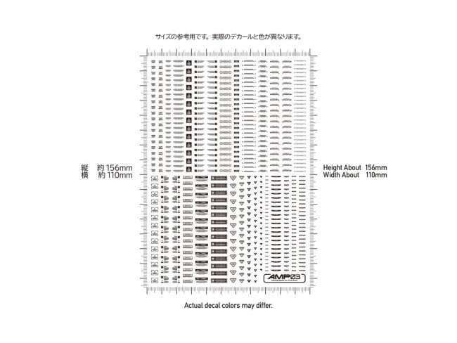 デカールまでこだわりたい人へ! 極小サイズクラスのデカールが作品の精密感をアップ!! メカモデル向けの水転写式汎用コーションデカール「AMP」は、近年の細分化されたメカモデルのパーツ割に対応するため、デザインを刷新した新シリーズです。 装飾を削ぎ落としたスタンダードなデザインが中心で、作品の精密感と情報量を高めます。 ある程度の可読性を確保しているため、ブログの文字解説を参考に、最適な貼り付け場所を選定してください。 極小サイズながらも高精細な印刷が施されており、モデルのスケール感を損なうことなく細部を彩り、模型の持つ魅力を最大限に引き立てます。 また、光沢仕上げの際にクリアコート層の濁りが目立ちにくい「研ぎ出し対応」のグロスデカールです。 デカールの文字やデザインの解説記事はこちらで公開しています。 https://hiqparts.info/amp-ref 水転写式デカール サイズ/110mm x 156mm 生産国/日本製 AMPコーションデカール01 「01」は汎用性が高く、使用頻度の高い柄を多く収録しています。 AMPコーションデカール02 「02」は汎用性が高く、かつアクセントが大きい柄を多く収録しています。 「01」と合わせて使います。 AMPコーションデカール03(本品) 「03」は中型と長文のマークを収録。 「01」、「02」と合わせて使用します。 AMPコーションデカール04 「04」は大型と数字入り、長文のマークを収録。 「01」、「02」、「03」と合わせて使用します。