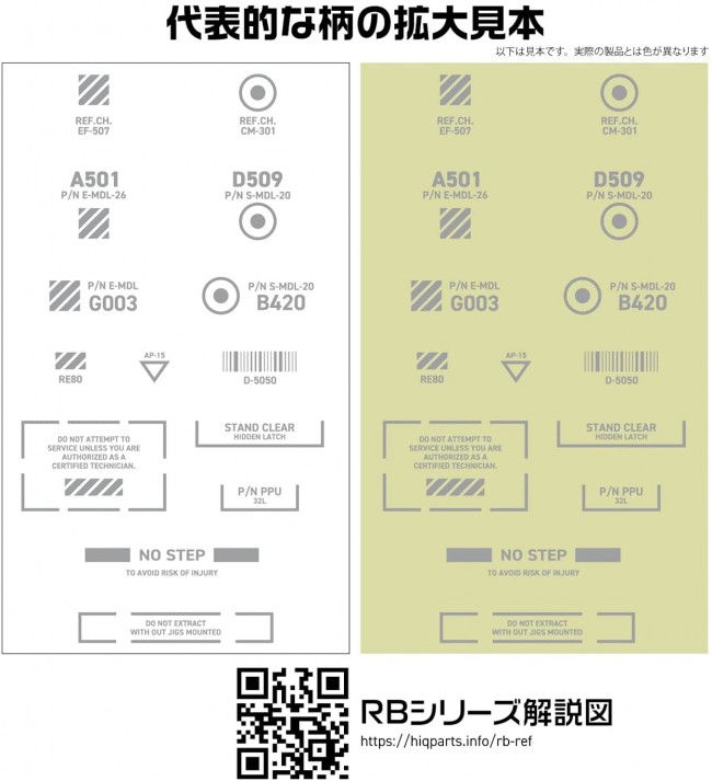 【スケール】1/144 【サイズ】110mm×156mm 「精緻」がテーマのコーションデカール 細かな印刷が精密感を引き出す! メカモデル向けの水転写式汎用コーションデカール。装飾を削ぎ落としたスタンダードなデザインが中心です(装飾ありのアクセント的なデザインは「RB02」に収録されています)。ある程度の可読性を確保していますので、公式ブログの文字解説を参考に貼る場所を選定してください。 基本色1色のみを使用する「ワンカラー」シリーズは、スッキリとしたイメージ作りに最適。光沢仕上げの時に、クリアコート層の濁りが目立ちにくい「研ぎ出し対応」のグロスデカールです。デカールが薄くて小さいため、扱いにくい場合は筆を使用して下さい。水を含ませた面相筆を使ってデカールをスライドさせ、水分を吸い取る時も筆を使うと扱いやすくなります。