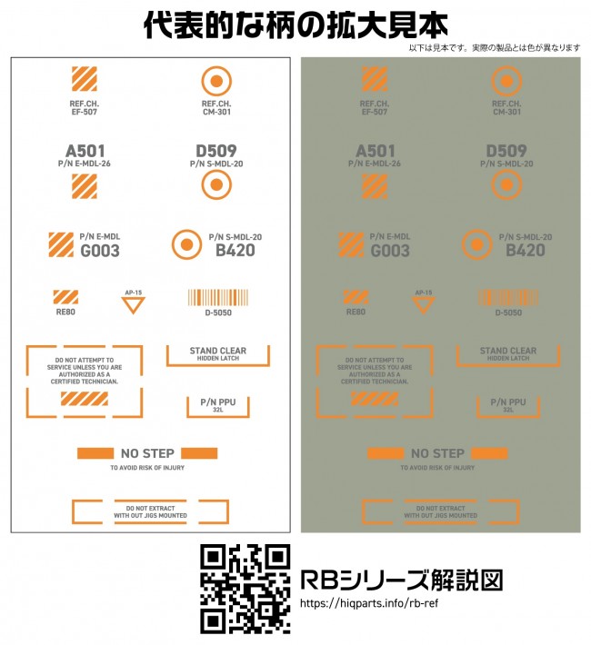 【スケール】1/144 【サイズ】110mm×156mm 「精緻」がテーマのコーションデカール 細かな印刷が精密感を引き出す! メカモデル向けの水転写式汎用コーションデカール。装飾を削ぎ落としたスタンダードなデザインが中心です(装飾ありのアクセント的なデザインは「RB02」に収録されています)。ある程度の可読性を確保していますので、ブログの文字解説を参考に貼る場所を選定してください。 基本色とアクセント色の2色を組み合わせたマルチカラー仕様で、プラスチックモデルを精密な印象に仕上げ、完成度アップに貢献します。また、光沢仕上げの時に、クリアコート層の濁りが目立ちにくい「研ぎ出し対応」のグロスデカールです。デカールが薄くて小さいため、扱いにくい場合は筆を使用して下さい。水に濡らした面相筆を使ってデカールをスライドさせ、水分を吸い取る時も筆を使うと扱いやすくなります。