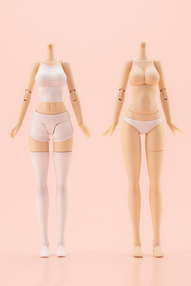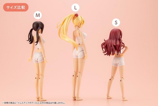 フィギュア用 小物・アクセサリーパーツ  大好評の素体シリーズ「ドレスアップボディ」にLサイズが登場!色んなお洋服を着せて楽しんでね♪  プロポーションは佐伯リツカをベースに頭部装着状態で全高約160mmになるように設計しました。 グラマラスなプロポーションを好むユーザーさんにおすすめです。  発売中のMサイズと同じく「リラックスウェア」タイプと「インナーウェア」タイプの2種類がセットになっており、 シンプルながら良く動く構造なので改造用の素体としておすすめですよ。  ▼こだわりポイント  【2種類のボディタイプ】 本製品は素体部分が2種類セットになっています。※創彩少女庭園シリーズの頭部は付属しません。 リラックスウェアはショート丈のキャミソールとショートパンツを着用している造形となっており 自宅でくつろいでいるイメージで遊べる仕様です。 インナーウェアタイプは別売りのタイニークローゼット(コトブキヤ限定品)や 15cm~16cm程度のモデル用に制作されている各種ドール服を着せて遊べる仕様になっています。 ※デザイン・商品仕様によっては着せられない場合もございますので予めご了承ください。  【3種類の長さの首ジョイント】 「Aタイプ(創彩少女庭園対応)」「Bタイプ(メガミデバイス対応)」「Cタイプ(ドール服対応)」の3種類が付属。 Bタイプはメガミデバイスの頭部に対応するためAタイプより少し首が長く造形されています。 CタイプはBタイプよりさらに首が長くなっておりドール服の襟で首が埋まらないようにするために使用します。 また、首のボールジョイント径は「5mmタイプ」「6mmタイプ」の2種類が付属しており、 5mmタイプは「創彩少女庭園」「アルカナディア」「フレームアームズ・ガール」「無限邂逅メガロマリア」に対応、 6mmタイプは「メガミデバイス」に対応しています。  【首のスライドジョイント】 首のジョイントは小鳥遊 暦【水着】に採用されている前後へのスライドギミックのあるタイプを採用しており 「顎を引く」「見上げる」といった上下への可動ギミックを向上させる効果があるほか、 髪の毛による可動干渉を避ける目的で使用することが可能です。  【選べるソックスのタイプ】 ソックスのタイプは「ショートソックス」「ハイソックス」「オーバーニーソックス」を選べるようになっており、膝下からまるごと交換する方式です。 ※ショートソックスタイプ・ハイソックスタイプ時に使用する太ももは素足タイプと共用です。  【本体の成型色】 胴体部分の成型色は「創彩少女庭園」で多く使用されているスキンカラーAを採用しており、 「アルカナディア」や「フレームアームズ・ガール」「メガミデバイス」などと組み合わせて遊ぶことが可能です。  ▼付属品 1)リラックスウェアタイプ胴体×1 2)インナーウェアタイプ胴体×1 3)ショートソックス脚パーツ×左右分 4)ハイソックス脚パーツ×左右分 5)オーバーニーソックス脚パーツ×左右分 6)素足パーツ×左右分 7)手首パーツ7種「持ち手(通常)」「持ち手(狭)」「持ち手(広)」「持ち手(丸)」「握り手」「指さし手」「平手」×各左右分 (付属する手首は1セットのため、リラックスウェアとインナーウェアタイプの両方を同じ手首パーツにはできません) 8)首ジョイントAタイプ(リラックスウェア用)×1 9)首ジョイントAタイプ(インナーウェア用)×1 10)首ジョイントBタイプ(リラックスウェア用)×1 11)首ジョイントBタイプ(インナーウェア用)×1 12)首ジョイントCタイプ(リラックスウェア用)×1 13)首ジョイントCタイプ(インナーウェア用)×1 14)首ボールジョイント5mmタイプ×2 15)首ボールジョイント6mmタイプ×2 16)オプション足首ジョイント×左右分(まどか【水着】暦【水着】リツカ【水着】に付属するサンダルや足首に対応しています) 17)胸部関節用スペーサー×2  (C) KOTOBUKIYA -----  作品 創彩少女庭園  シリーズ キャラクタープラモデル  スケール 1/10 製品サイズ 全高:約142mm  製品仕様 プラモデル  パーツ数 51~200  素材 PVC(非フタル酸)・ABS・POM  設計 株式会社プロスリンク  品番 JK019  ※画像は試作品です。実際の商品とは多少異なる場合がございます。また撮影用に塗装されております。  (コトブキヤ ウェブサイトより)