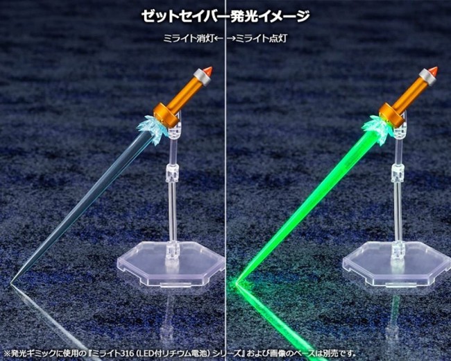 ●ミライト取り付け専用ゼットセイバー持ち手パーツは内部にミライト316(LED付リチウム電池)シリーズを組み込むことができ、クリア刃の刀身を発光させることが可能。