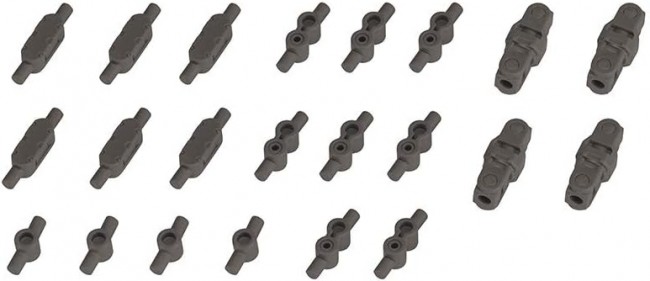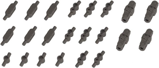 使い勝手の良いシンプルな3mm径ジョイントがセットになって登場。 ユニバーサルジョイントタイプはロール軸可動があり、ジョイントに捻りの動きをつけることが可能です。 ※成型色はガンメタです。成型素材はHIPS製です。 商品仕様 ■ユニバーサルジョイントタイプはプラキャップでの可動に加えてロール軸によりジョイントに捻りを加えることができます。 ■リンクジョイントタイプは分解してシンプルジョイントタイプと組み合わせて無限に連結することが可能です。 ■すべてのジョイントは軸と穴が3mm径に統一されているので自由に組み合わせて使用することができます。 付属品 ■ユニバーサルジョイントタイプ×4 ■ダブルジョイントタイプ×6 ■リンクジョイントタイプ×8 ■シンプルジョイントタイプ×4 (C) KOTOBUKIYA