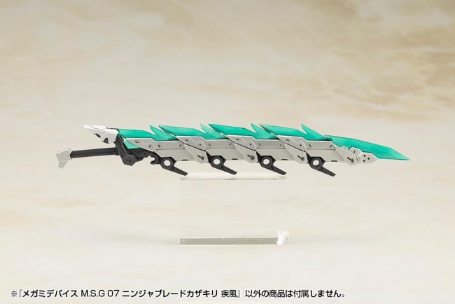 ディテールアップ用パーツ(SF) 「美少女×メカニック」シリーズ『メガミデバイス』のサポートシリーズ拡充! 最新作は「メガミデバイスM.S.G 07 ニンジャブレード カザキリ 疾風」!! 『メガミデバイスM.S.G』はメガミデバイスに対応したモデリングサポートグッズをリリースしていくシリーズです。 コンセプトは変幻自在のニンジャウェポン! 変形合体ギミックを備えたニンジャブレードが登場! メガミデバイス M.S.Gとしては初の武器アイテムとなります。 納刀状態では大型の刀であるザンバブレードとして使用可能。 抜刀すると大鞘とニンジャブレードに分離し、大鞘は先端部を取り外し変形させることで十字手裏剣にモードチェンジします。 大鞘から取り外した先端部はグリップを取り付けクナイブレードとして使用できるほか、ニンジャブレード本体と合体しニンジャブレードをパワーアップさせることができます。 十字手裏剣は内側に突き出たグリップを持つことが可能なほか、付属の手裏剣用グリップを接続する事で様々なアクションに対応可能です。 各部のグリップはメガミデバイスシリーズの手首に合わせたサイズでしっかりと保持することが可能。 メガミデバイスBlock2シリーズのプラ製手首にも対応しております。 また、メガミデバイス以外のフレームアームズ・ガール、創彩少女庭園、アルカナディアの武器持ち手でも持たせることができます。 また、3㎜軸穴対応のジョイント類が豊富に付属し、大鞘部分の3㎜穴を介して任意の位置に装備する事が可能。 カスタマイズの幅が広がります。 成型色は豪華な3色成型! ニンジャブレードと手裏剣の各部の刃はクリアーパーツで成型され、より鋭く、よりメガミデバイスのキャラクター達を美しく演出します。 疾風は風属性をイメージしたクリアーグリーン、ソリッドパーツはM.S.Gグレーとシルバーの成形色で使いやすいカラーとなっております。 デザインはメガミデバイスシリーズのメカ原型を手掛けるたすく氏。 ガレージキットディーラー「Underconstruction(あんこ社)」として活動。 その高いデザイン性とギミックは評価され、参加する各イベントでは多くのユーザで賑わっています。 本キットはあんこ社様がガレージキットとして販売していた「ニンジャブレード”カザキリ”」のギミックをベースにM.S.G用に新たにリデザインしていただきました。 【付属品】 ・可変分離式大鞘×1 ・ニンジャブレード×1 ・大型十字手裏剣用グリップ×1 ・懸架用ジョイントA×2 ・懸架用ジョイントB×2 ・クナイブレード用グリップ×1 ・3mm軸×2 (C) KOTOBUKIYA (C)Masaki Apsy (C)Toriwo Toriyama ----- 作品 メガミデバイスM.S.G シリーズ キャラクタープラモデル スケール 1/1 製品サイズ 全長:約170mm 製品仕様 プラモデル パーツ数 1~50 素材 PS 設計 たすく(あんこ社) 品番 KP818J ※画像は試作品です。実際の商品とは多少異なる場合がございます。また撮影用に塗装されております。 (コトブキヤ ウェブサイトより)