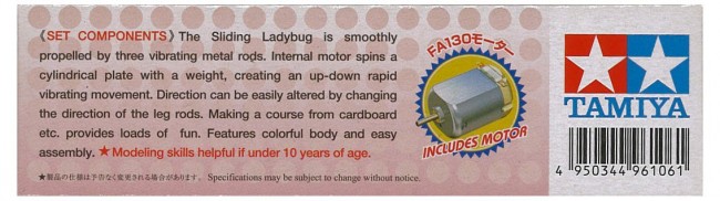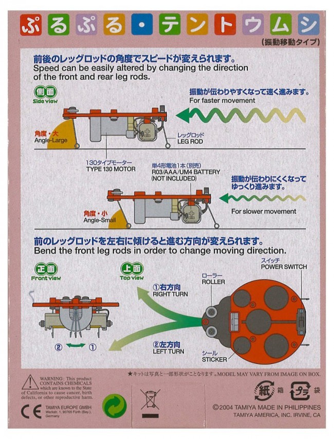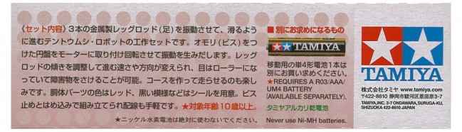 3本の金属製レッグロッド (足)を振動させて、滑るように進むテントウムシ・ロボットの組立工作セットです。