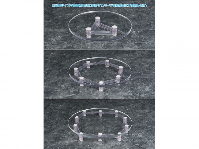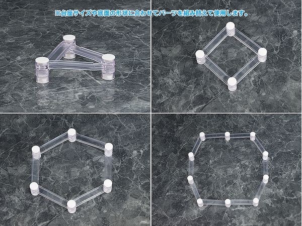ディスプレイベース/ディスプレイスタンド/ディスプレイケース/ケース 等 新たな展示空間を創出!可変式スケルトン支柱 限られたスペース、増え続ける新作、お気に入りだったけど、もう仕舞わないと新しいものが置けない。 そんな諦めを軽減するアイテムBase Float。 Base Floatはフィギュアのベース下に設置する高さ可変式スケルトン構造。 主張せず自然にフィギュアを持ち上げ、複数のベースを重ね合わせ、新たな展示空間を創出します。 1セットで直径7cmのベースから18cmのベースまで対応。 複数セットでどんどん拡張できます。 ■基本部品構成(1セット内容) アーム×10本 延長ジョイント5mm×10個 延長ジョイント15mm×10個 ゴムブッシュ×20個 商品仕様 仕様 クリアABS製台座支柱 原型制作 Phat! メーカー ファット・カンパニー 販売元 グッドスマイルカンパニー (C)Phat! 注意事項 商品について 掲載の写真はサンプル品を撮影しています。実際の商品とは一部仕様等異なる場合があります。 (グッドスマイルカンパニー ウェブサイトより)