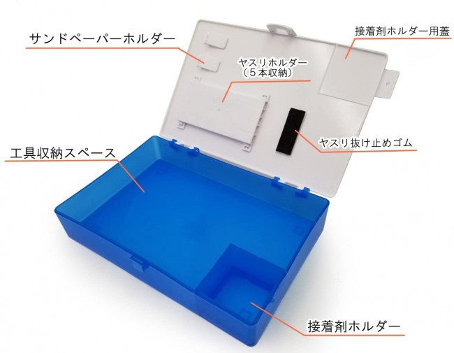 接着剤のビンなどしっかりホールドできるホルダーやフタの裏にはヤスリやサンドペーパー等に使えるホルダーとクリップを配置しています。