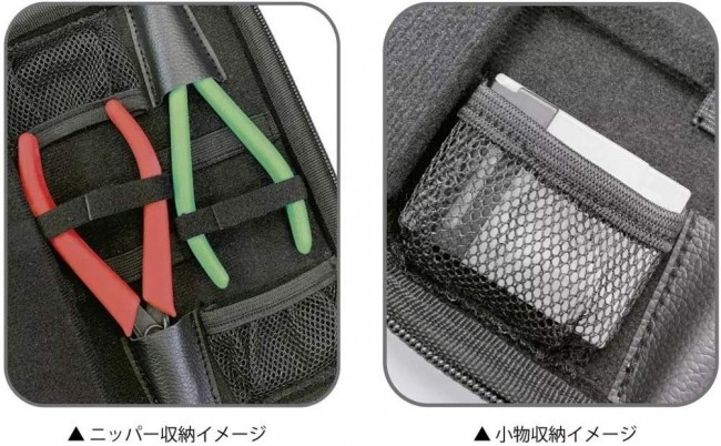 マジックテープやネットポケット、ゴムバンド、ニッパーの刃こぼれを防ぐ、ニッパーホルダー、棒ヤスリホルダーなどの多彩なギミックが沢山。