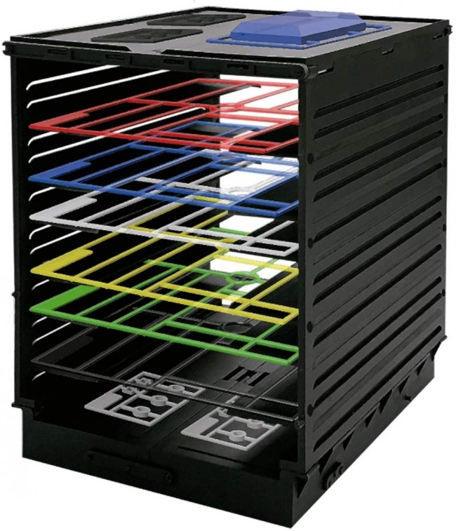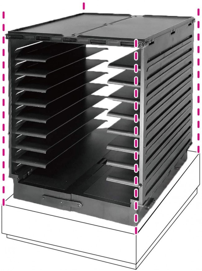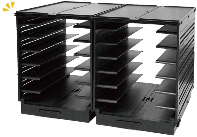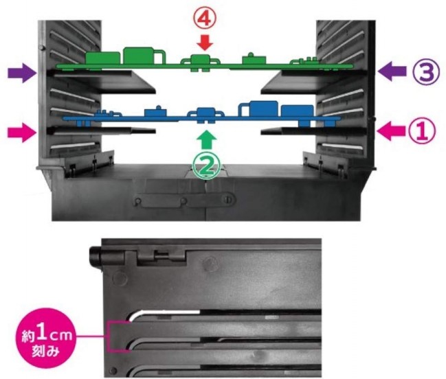 プレートの間隔は約1cm刻みに設計しており、下に置いたランナーの高さに合わせながら次のプレートを上に差し込むことで空間を無駄なく使用しながら収納することができます。