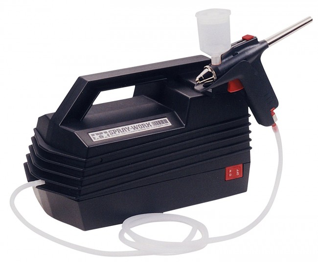 1988年の登場以来、グラデーションや迷彩など吹き付け塗装の入門用として好評の「スプレーワーク・エアーブラシセット」がさらに進化しました。コンプレッサーはケース本体のデザインを一新して作動音を当社比で約1/2と大幅に低減、もちろん安定したエアー供給もポイントです。またエアーブラシは初心者の方でも取り扱いが簡単なシンプルな構造で、ノズル口径は0.3mm。幅約2mmの細い線から1/24スケール・カーモデルのボディなど、幅広い吹き付け塗装を手軽にお楽しみいただけます。また、電源は充電式のタミヤ7.2Vバッテリーパック各種(別売)を使用。また専用のACアダプター(別売)を使用すれば、ご家庭のコンセント(AC100V)も電源として使えます。