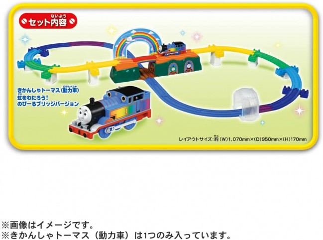 大変!橋がなくて進めない! と思ったら虹がのびて橋になる!トーマスと一緒にハラハラどきどきの冒険を楽しめるオールインワンセット! 虹がのびーる!不思議なアクションが楽しいプラレールトーマスのセットが登場です。 レインボ―カラーの特別なトーマス車両、レインボーカラーのカラフルな虹いろレール、半透明の雲のトンネルなどここだけの特別なパーツがたくさん入ったオールインワンセットです。 このセットだけで立体感のあるレイアウトを組むことができます。 1.がたがたする谷を抜けて出発したトーマス 2.雲のトンネルを抜けて虹いろのレールをぐんぐん登っていくと… 3.大変!橋がなくて進めない! 4.すると…ビックリ!虹がのびて橋になったぞ! 5.ふう!無事にわたれてよかった! 【セット内容】きかんしゃトーマス(動力車)虹をわたろう!のびーるブリッジバージョン(1),のびーるブリッジ本体(1),のびーるブリッジうけ本体(1),がたがたつなぎレール(1),坂曲線レール(B)(黄色)(2),坂曲線レール(B)(緑色)(2),坂曲線レール(B)(水色)(2),坂曲線レール(B)(藍色)(2),曲線レール(3),曲線レール(紫色)(1),1/2直線レール(2),1/2直線レール(黄色)(2),1/2直線レール(紫色)(1),1/4直線レール(凸凸)(1),1/4直線レール(凸凹)(1),雲のトンネル(1),坂曲線レール用橋脚S(2),坂曲線レール用橋脚M(2),坂曲線レール用橋脚L(2),虹のパネルベース(2),虹のパネル(1),シール(1),部品注文書(1) (c) TOMY (c)2022 Gullane (Thomas) Limited. (c)2022 HIT Entertainment Limited. 単3形乾電池1本使用(電池は別売です。)