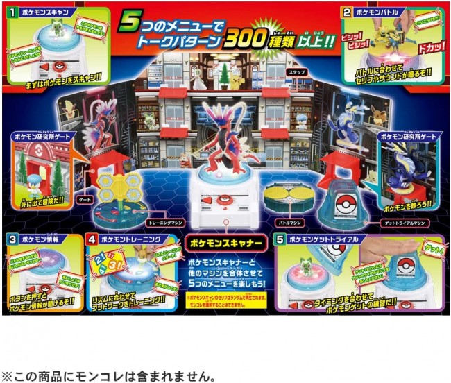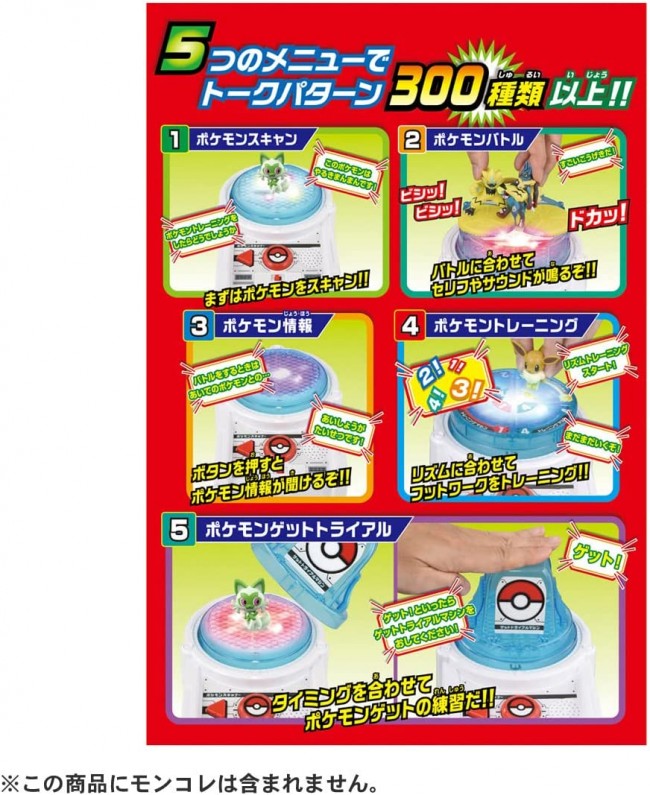 コレクショントイ( フィギュア・完成品 ) 5つのメニューでトークパターンは300種類以上! バトルにゲットにトレーニング、ポケモン情報やポケモンスキャンまで! ①ポケモンスキャン 「ポケモンスキャナー」にモンコレを置いて、まずはモンコレをスキャン! スキャナーにモンコレを置いて押し込むと、セリフ音声が鳴ります。 『このポケモンはやるきまんまんです!』『ポケモントレーニングをしたらどうでしょうか』 ※ポケモンスキャンのセリフ音声はランダムで再生されます。 モンコレを識別することはできません。 ②ポケモンバトル 「ポケモンスキャナー」と「バトルマシン」を合体させて、モンコレバトル! バトルマシンに衝撃を与えると、バトルに合わせてセリフやサウンドがなるぞ! 『すごいこうげきだ!』 『ビシッ!ドカッ!』 ③ポケモン情報 「ポケモンスキャナー」のボタンを押すと、ポケモン情報が聞けるぞ! 『バトルをするときはあいてのポケモンとの、あいしょうがたいせつです!』 ④ポケモントレーニング 「ポケモンスキャナー」と「トレーニングマシン」を合体させて、モンコレをトレーニング! リズムに合わせてモンコレを動かし、フットワークをトレーニングしよう! 『リズムトレーニングスタート!まだまだいくぞ!』 ⑤ポケモンゲットトライアル 「ポケモンスキャナー」と「ゲットトライアルマシン」を合体させて、モンコレをゲットする練習だ! タイミングを合わせて、ゲットトライアルマシンをおそう! 『ゲット!といったら、ゲットトライアルマシンをおしてください!』 『ゲットせいこう!』 商品内容 ポケモン研究所ボード(1)、ポケモンスキャナー(1)、バトルマシン(1)、トレーニングマシン(1)、ゲットトライアルマシン(1)、ターゲット(1)、ステップ(4)、ゲート(2)、シール(1)、取り扱い説明書(1) (C)Nintendo・Creatures・GAME FREAK・TV Tokyo・ShoPro・JR Kikaku (C)Pokemon (タカラトミー ウェブサイトより)