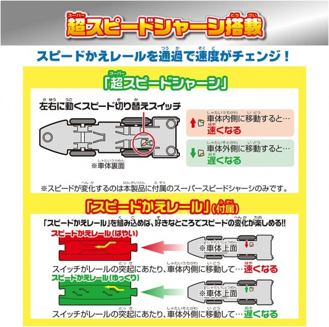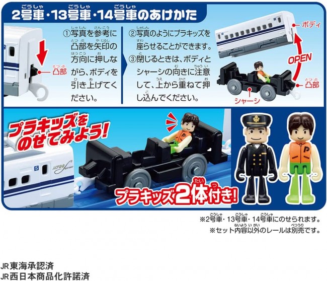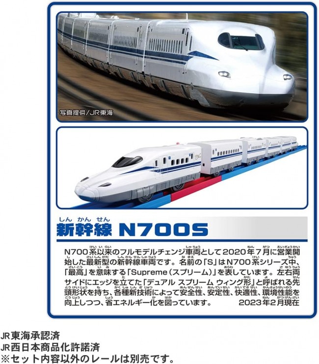 鉄道模型(電動・レール式 等) ■「新幹線 N700S」がモデル ■超スピードシャーシ搭載、スピードかえレールを通過すると電動走行の速度が変わります。 ■6両編成でそれぞれ連結・切り離し可能 ■スイッチOFFで手転がし遊びが可能 ■スピードかえレール(はやい・ゆっくり)各1本付 ■プラキッズ2体付 ■2号車・13号車・14号車はプラキッズ乗車遊びが可能 ※セット内容以外のレールは付属しません。 商品内容 車両本体6両編成(1)、プラキッズ(車掌さん)(1)、プラキッズ(お客さん)(1)、スピードかえレール(はやい)(1)、スピードかえレール(ゆっくり)(1)、部品注文書(1) (C)TOMY JR東海承認済 JR西日本商品化許諾済 (タカラトミー ウェブサイトより)