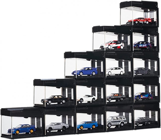ディスプレイケース ・LEDライトによりトミカをライトアップ。 ・コンパクトなボディで場所を取らずに飾りやすいサイズ。★約100mm(W)・75mm(H)・60mm(D) ・積み重ねや横につなげて、展示することが可能。 ※本商品は保護や保管を目的とした商品ではありませんのでご注意ください。 商品内容 本体(カバー、ベース)(1)、パーツカバー(1)、タイヤ止め(4) (C)TOMY (タカラトミー ウェブサイトより)