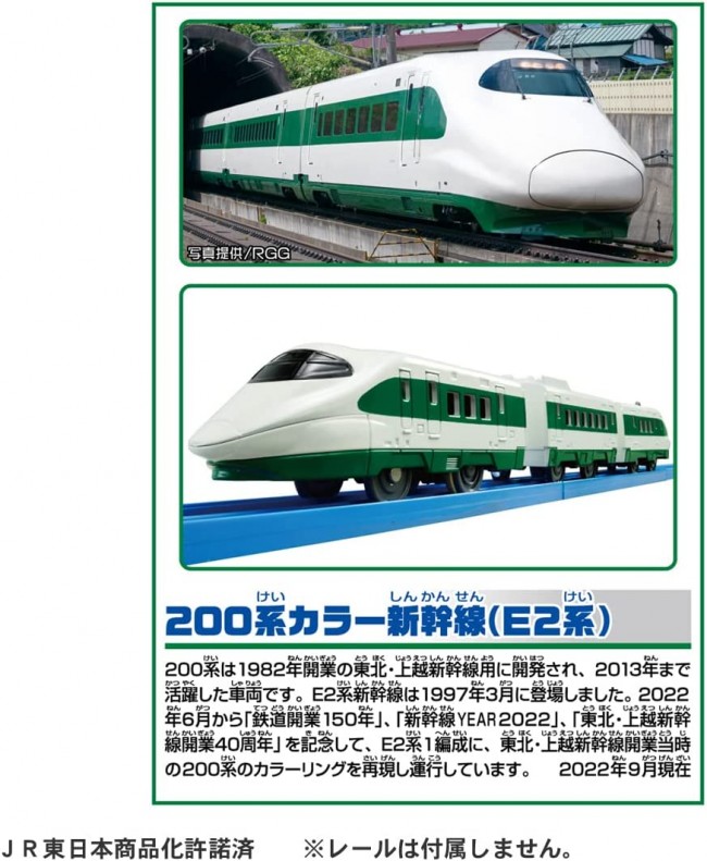 「鉄道開業150年」「東北・上越新幹線開業40周年」を記念した200系カラー新幹線(E2系)と、E3系新幹線こまちがダブルセットになってプラレールに登場。 E2系新幹線は東北・上越新幹線開業当時の「200系新幹線」のカラーリングを再現し、E3系新幹線は秋田新幹線開業当時の「こまち」を再現しています。 ■200系カラー新幹線(E2系)がモデル ■E3系新幹線こまちがモデル ■「200系カラー新幹線(E2系)」「E3系新幹線こまち」ともに連結仕様の車両(3両目のレバーを引くとマグネット連結器が現れ、2つの車両を連結して走らせることが出来ます) ■3両編成でそれぞれ連結・切り離し可能 ■どちらも2スピードで電動走行、スイッチOFFで手転がし遊びが可能 ※レールは付属しません。 ※実際にはこの連結編成は存在しません。 【セット内容】200系カラー新幹線(E2系)車両本体(1),E3系新幹線こまち車両本体(1),部品注文書(1) (c) TOMY JR東日本商品化許諾済 200系カラー新幹線(E2系):F単3形乾電池1本使用(電池は別売です。) E3系新幹線こまち:単3形乾電池1本使用(電池は別売です。) ※誤飲防止のため、電池ケース蓋に「ネジ止め式」を採用しています。