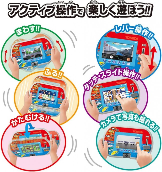 アクティブな操作で、トミカ・プラレールと遊んで学べる! 遊んで学べるアプリがたくさん!全61種!99アプリ! ■アクティブに操作しよう! まわして、かたむけて、ふって、レバーを上下させて…かんたん、やりたくなるアクティブ操作! ■トミカ・プラレールとカメラで遊べる! 持っているトミカ・プラレールと画面が連動!カメラで撮影したトミカ・プラレールが画面の中に登場するよ!(※トミカ(ミニカー)、プラレール(車両、レール)は別売りです。) ■トミカ・プラレールで楽しく学べる! トミカ・プラレールが登場する学習アプリがたくさん!【プログラミング】【いろとかたち】【ことば】【かず】【チャレンジクイズ】に挑戦! ■たくさん遊んでカードを集めよう! アプリをクリアしてスタンプをためよう! たまったスタンプで「トミカカード」「プラレールカード」「じょうけいカード」がもらえるよ!全100種以上! 【セット内容】本体(1),USBケーブル(タイプA-タイプminiB)(1),取扱説明書(1) (C) TOMY JR東日本商品化許諾済 JR東海承認済 JR西日本商品化許諾済 JR九州承認済 JR貨物承認済 リチウムポリマー電池1個使用(電池は内蔵です。) ※タカラトミー玩具専用ACアダプターをご使用ください。