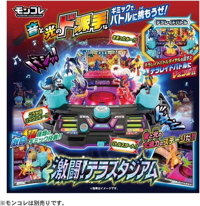 コレクショントイ( フィギュア・完成品 ) 10種類の激闘ギミックと2つのバトルモードで、 モンコレバトルをド派手に楽しもう! ◆10種類の激闘ギミック搭載! ①バトルフィールドセンサー キミのバトルに合わせて、『ドカッ!』『バシッ!』迫力のバトルサウンドが鳴るぞ! フィールド(床面)に衝撃を与えると攻撃サウンド&実況が鳴り響く! さらに!バトルの展開に合わせてスタジアムの床もライトアップ! バトルシーンに合わせて『きゅうしょにあたったー!』『こうかはばつぐんだ!』実況も流れる! 自分だけのオリジナルバトルを繰り広げられるぞ! ②ダイビングギミック パーツ上部からモンコレを落として攻撃を繰り出せるぞ! ③アクロバットギミック すくいあげてのアクロバットアタック! ④ダッシュギミック モンコレを直線的に相手に当てるワザが繰り出せるぞ! ⑤じょうたいいじょうサウンド 『ねむり状態になってしまったーっ!』 どく状態・やけど状態・まひ状態・ねむり状態・こおり状態 がランダムで音声が再生されるぞ! ⑥テラスタルサウンドボタン 『おーっと!ここでテラスタルだ!』 テラスタルのサウンドと音声が流れるぞ! ⑦ぼうぎょサウンドボタン 『まもりを固めてぼうぎょだ!』 ぼうぎょのサウンドと音声が流れるぞ! ⑧かいふくサウンドボタン 『かいふく!反撃なるか?』 かいふくのサウンドと音声が流れるぞ! ⑨ダブルHPゲージボタン 最大4体のポケモンのHPを操作可能! HPゲージを動かして、バトルの行方を演出だ! どちらかのゲージを0にすると、勝負決着!最強のモンコレは誰だ!? ⑩テラレイドバトルダイヤル 対戦バトル中にダイヤルを回すと、 光・サウンドとともにステージがリフトアップ! テラレイドバトルに切り替わるぞ! ◆対戦バトル・テラレイドバトル ふたつのバトルモードで楽しめる! ・対戦バトルの流れ 赤コーナーVS青コーナーでバトルだ! 1VS1のバトルも、2VS2のバトルもできるぞ。 激闘ギミックを駆使して、ド派手なバトルを演出しよう! →どちらかのHPゲージが全て0になると、バトルが終了! ・テラレイドバトルの流れ 1VS4で協力してバトルだ! 対戦バトル中にダイヤルを回すと、テラレイドバトルに切り替わるぞ! 相手となるポケモンを中央に置き赤コーナー、青コーナー協力して、 テラスタルポケモンと1VS4のレイドバトルに挑戦だ! →協力して攻撃を続ければテラスタルポケモンに勝利できるぞ! 『テラスタルポケモンを倒したぞ!』 →4体のHPを0にすると戦闘不能になりゲーム終了だ! 『戦闘不能!』 ※モンコレは別売りです。 商品内容 テラスタジアム(1)、センターステージ(1)、フィールドボード(2)、背景ボード(1)、専用シール(1) (C)Nintendo・Creatures・GAME FREAK・TV Tokyo・ShoPro・JR Kikaku (C)Pokemon (タカラトミー ウェブサイトより)