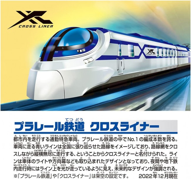 プラレール鉄道の中でNo.1の編成本数を誇る、都市内を走行する通勤特急車両です。 車両に走る青いラインは全国に張り巡らせた路線をイメージしており、路線網をクロスしながら縦横無尽に走行するということからクロスライナーと名付けられています。 ■プラレール鉄道のオリジナル車両 ■3両編成でそれぞれ連結・切り離し可能 ■中間車はドアが開閉し、付属の乗客ブロックで載せ降ろし遊びが可能 ■1スピード・スイッチOFFで手転がし遊び可能 ■プラ列車カード付 ※レールは付属しません。 【セット内容】車両本体(1),乗客ブロック(1),中間車ドア(2),シール(1),プラ列車カード(1),部品注文書(1) (C) TOMY 単3形乾電池1本使用(電池は別売です。)