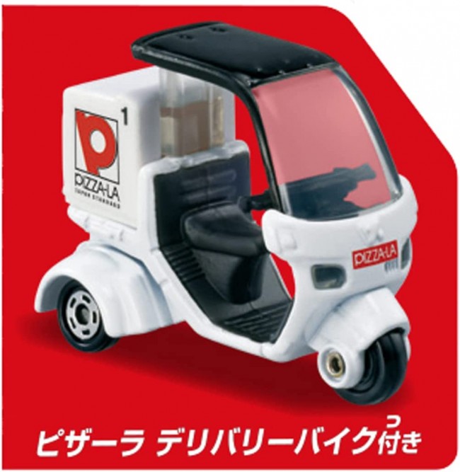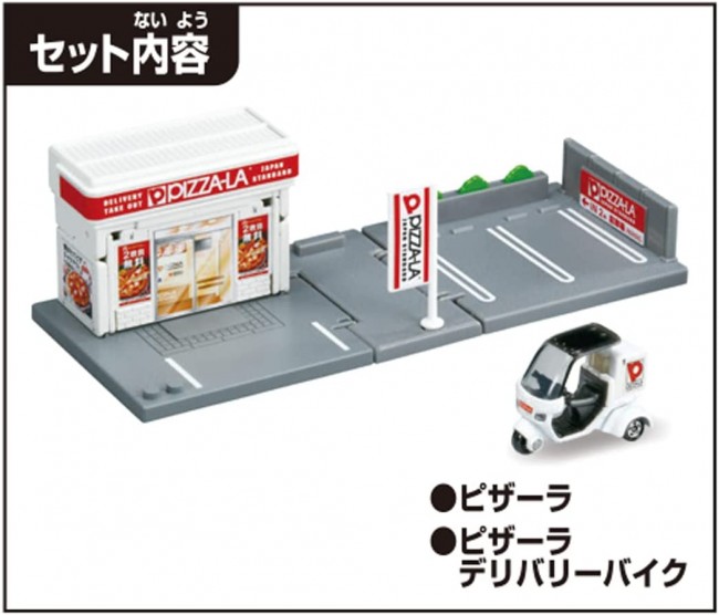 パッと開いてすぐ遊べるトミカタウンにピザーラが登場! ピザーラデリバリーバイクトミカ付き ピザーラのお店とデリバリーバイクのセットです。 店舗の外観や看板など本物のお店を忠実に再現しています。 組み立て、ラベル貼り不要で本体をパッと開くとすぐに遊べます。 また遊ばないときは折りたたんでコンパクトに収納が可能です。 ※ピザーラデリバリーバイク以外のトミカ(ミニカー)は別売りです。 【セット内容】ピザーラ(本体)(1),トミカ(ピザーラデリバリーバイク)(1) (c) TOMY (c) PIZZA-LA