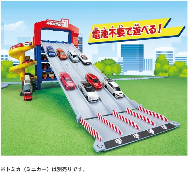 トミカ最大50台駐車&発車で遊べる「スライダーパーキング50」登場! ロングスライダーが全フロアへ自動で下降!トミカ最大50台一斉走行を楽しもう! ロングスライダー付き5階建て立体駐車場! トミカ駐車遊びに加えて、インパクト抜群のスライダー遊びが楽しめます。 ●各フロア&ループからトミカが次々一斉走行!スイッチを押すとロングスライダーが下がって全フロアからトミカが発車していくよ! ロングスライダーが1Fまで降りたらループスライダーが同時に発動するよ!大迫力のトミカ大量発車を楽しもう!! ●発車パターンいろいろ!一斉発車だけでなく、スイッチを切り替えて各フロアごとに発車させるなど、いろんな発車パターンを楽しめるよ! ●50台駐車可能なよくばりパーキング!トミカ最大50台駐車可能!いっぱい駐車しよう! ●スライダーを収納するだけ!簡単おかたづけ!遊び終わったら簡単におかたづけ出来て、そのままトミカを駐車して飾っておけるよ! ●電池いらずで遊べるよ! ※トミカ(ミニカー)は別売りです。 【セット内容】ゲートユニット(1),スライダーA(1),スライダーB(1),スライダーC(1),ループベースユニット(1),ループA(1),ループB(1),ループC(1),1Fフロア(1),2~4Fフロア(3),5Fフロア(1),スロープA(1),スロープB(1),ラベル(1),取扱説明書(1) (C) TOMY