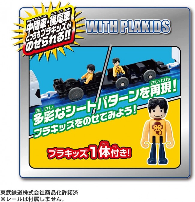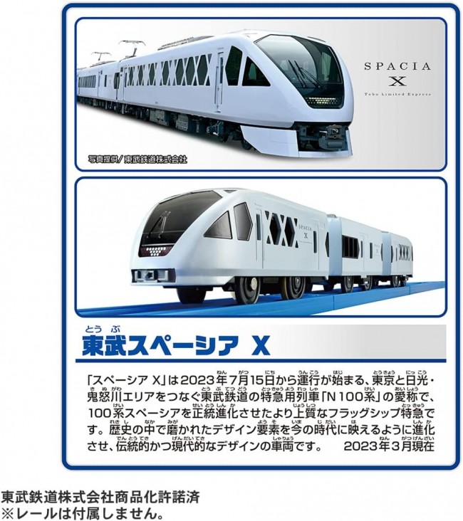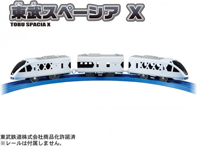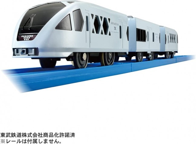 鉄道模型(電動・レール式 等) ■「東武鉄道 スペーシア X」がモデル ■3両編成でそれぞれ連結・切り離し可能 ■1スピードで電動走行、スイッチOFFで手転がし遊びが可能 ■プラキッズ1体付 ■中間車と後尾車はプラキッズ乗車遊びが可能 ■プラ列車カード付 ※レールは付属しません。 商品内容 車両本体(1)、プラキッズ(乗客)(1)、プラ列車カード(1)、部品注文書(1) (C)TOMY 東武鉄道株式会社商品化許諾済 (タカラトミー ウェブサイトより)