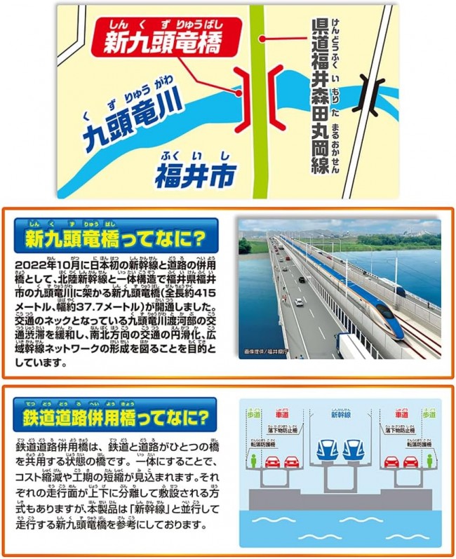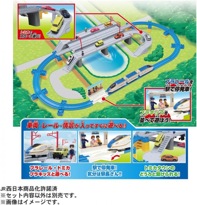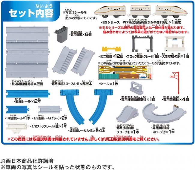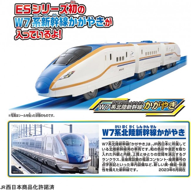 2024年春に金沢駅から敦賀駅へ北陸新幹線が延伸予定! 福井県に実在する「新九頭竜橋」をイメージした日本初の新幹線と道路の併用橋がプラレールに登場! W7系新幹線かがやきも入った車両・レール・情景が揃ったオールインワンセット! 2024年春に予定されている北陸新幹線延伸に伴い完成した、福井県に実在する日本初の新幹線と道路の併用橋「新九頭竜橋」をイメージした大きな橋が、W7系新幹線かがやきも入ったオールインワンセットになって登場! ■車両は「W7系北陸新幹線かがやき」がモデル。 ■鉄道道路併用橋は「新九頭竜橋」をイメージし、長さは直線レール2本分の大きな橋です。 ■プラレール・トミカ・プラキッズと一緒に遊ぶことができます。 ■付属の駅ではプラレールの停発車遊びができます。 ■別売のトミカタウンのどうろとつなげたり、「トミカと遊ぼう!くるぞわたるぞ!カンカン踏切セット」と連結できます。 ■別売のブロック橋脚を使うと立体交差のレイアウトを組むことができます。 ※プラキッズ・トミカ(ミニカー)や、セット内容以外は付属しません。 ※車両はESシリーズです。既存の車両商品とは一部仕様が異なります。 組み合わせによっては本来の遊びができない場合があります。 【セット内容】ESシリーズ W7系北陸新幹線かがやき(3両)(1),鉄道道路併用橋(2),専用接続スロープA・B(各2本)(4),専用架線柱(4),専用接続曲線スロープ①(1),専用接続曲線スロープ②(1),専用接続曲線支柱(1),専用橋脚(6),直線レール(2),1/2直線レール(1),1/2直線レール(グレー)(2),坂曲線レールA・B(各4本)(8),ブロック橋脚(グレー)(1),ミニ橋脚(12),1/2ストップレール(白)(1),大きな橋の駅(1),シール(1),部品注文書(1) (C) TOMY JR西日本商品化許諾済 単3形アルカリ乾電池1本使用(電池は別売です。) ※誤飲防止のため、電池ケース蓋に「ネジ止め式」を採用しています。