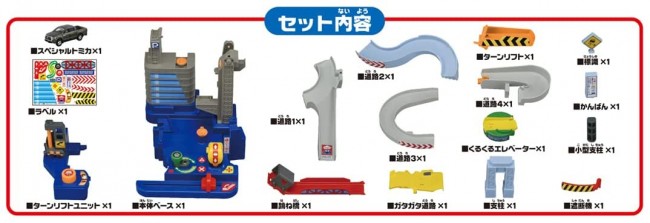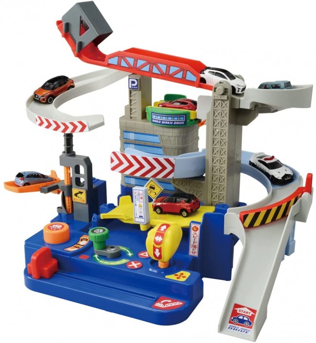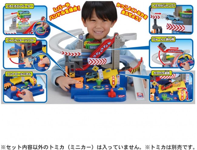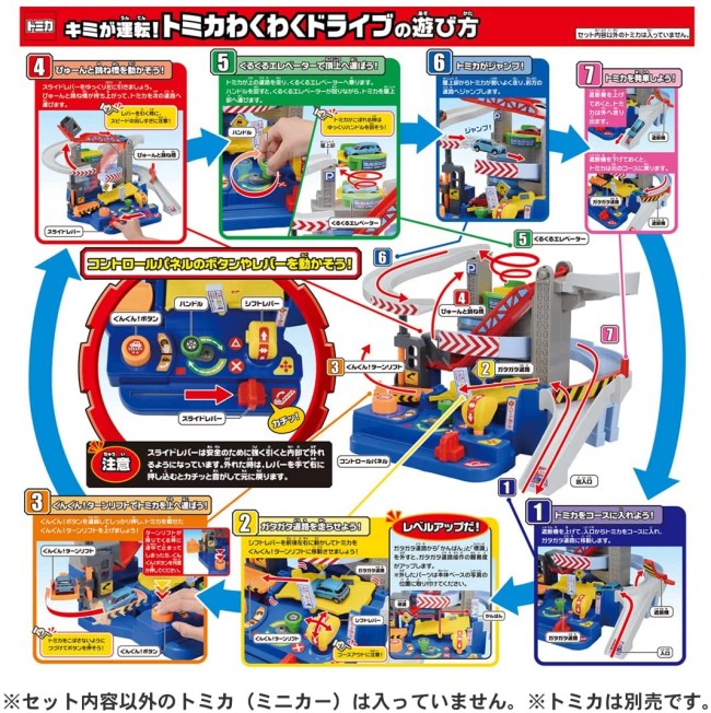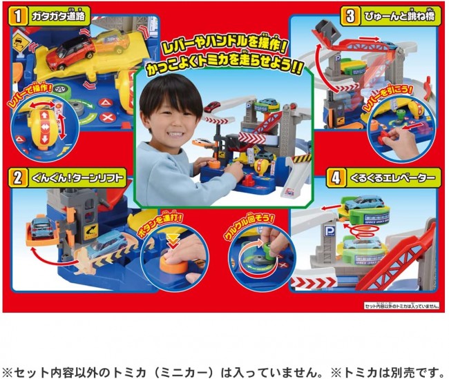 レバーやハンドルを操作してキミの手でトミカを運転!上手にコントロールしてトミカをかっこよく走らせよう! コントロールパネルのボタンやレバー、ハンドルを操作してトミカを走らせるドライブコースです。 ド派手なアクションをクリアして上手にトミカを走らせよう。 ガタガタ道路:シフトレバーを前後左右に動かしてトミカを上手に動かそう ぐんぐん!ターンリフト:ボタンを連打してターンリフトのトミカを登らせよう びゅーんと跳ね橋:スライドレバーを引いてトミカをのせた跳ね橋を持ち上げよう くるくるエレベーター:ハンドルを回すとエレベーターがくるくる回って急上昇 ジャンプ坂:勢いよく走ってジャンプ坂を飛び越えよう 初回版のみスペシャルトミカが付属します。 ※スペシャルトミカ以外のトミカ(ミニカー)は別売りです。 ※コントロールパネルを操作してもトミカは自動では走りません。 【セット内容】本体ベース(1),ターンリフトユニット(1),道路1(1),道路2(1),道路3(1),道路4(1),跳ね橋(1),ガタガタ道路(1),ターンリフト(1),くるくるエレベーター(1),遮断機(1),支柱(1),小型支柱(1),かんばん(1),標識(1),スペシャルトミカ(1),ラベル(1) (c) TOMY