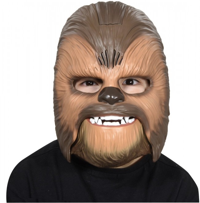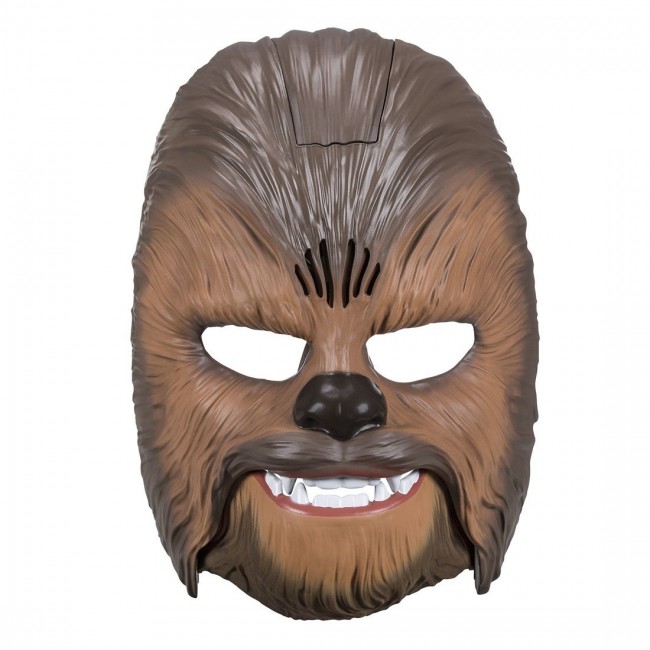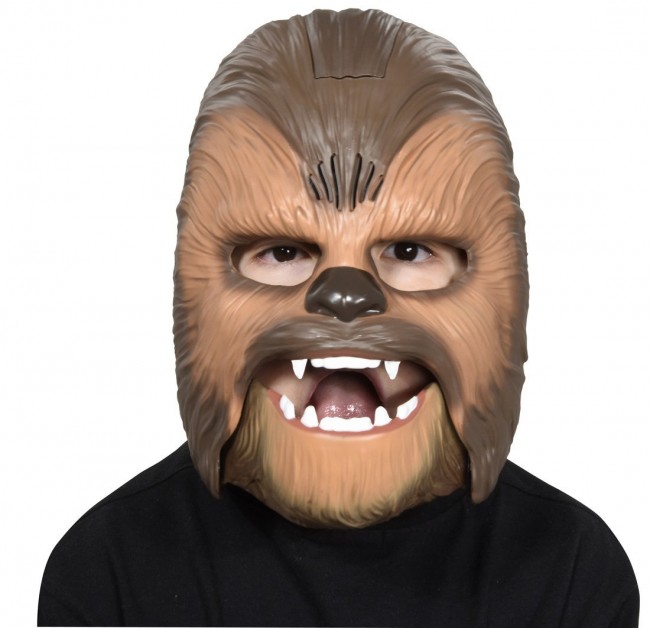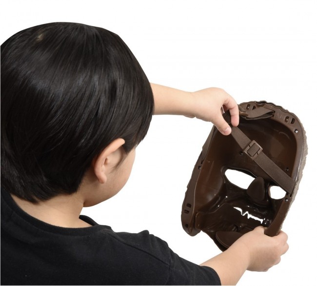 サイズ調整しながら装着して口を開けると、アゴの動きに合わせてチューバッカの声が出るマスクです。