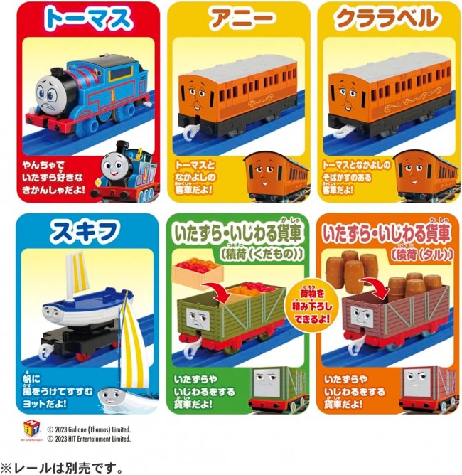 きかんしゃトーマスの新シリーズから、トーマスとアニー&クララベル、いたずら・いじわる貨車、スキフの車両セットが登場! きかんしゃトーマスの新シリーズから、トーマスとなかまたちの車両セットが登場です。 なかまたちをいっぱいつなげて走らせよう! ■トーマス(動力車):やんちゃでいたずら好きなきかんしゃだよ! ■アニー&クララベル:トーマスとなかよしの客車だよ! ■いたずら・いじわる貨車:いたずらやいじわるをする貨車だよ! ■スキフ:帆に風をうけてすすむヨットだよ! ・動力車のトーマスに連結し、プラレールのレールを走行して遊べます。 ・GOGOトーマスアクションセット(別売)といっしょに動力車1両で遊べます。 (※連結した状態では、「滝にダイブ!アドベンチャーピーク」、「ぐるっと宙返り!わくわくプレイランド」は走行できません。) ・レール、車止め、電池は別売です。 【セット内容】GOGOトーマス(動力車)(1),アニー(1),クララベル(1),いたずら・いじわる貨車(1),いたずら・いじわる貨車(1),スキフ(1),積荷(くだもの)(2),積み荷(タル)(2),部品注文書(1) (C) TOMY (C)2023 Gullane (Thomas) Limited. (C)2023 HIT Entertainment Limited. 単3形アルカリ乾電池1本使用(電池は別売です。) ※誤飲防止のため、電池ケース蓋に「ネジ止め式」を採用しています。