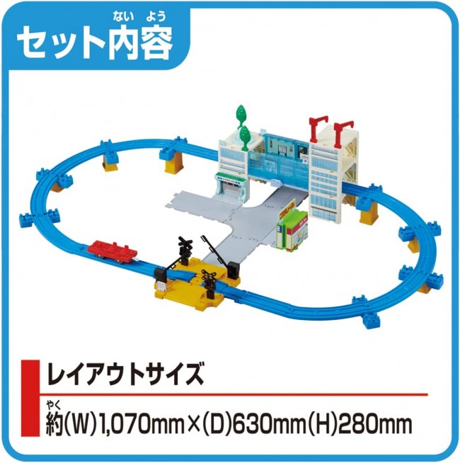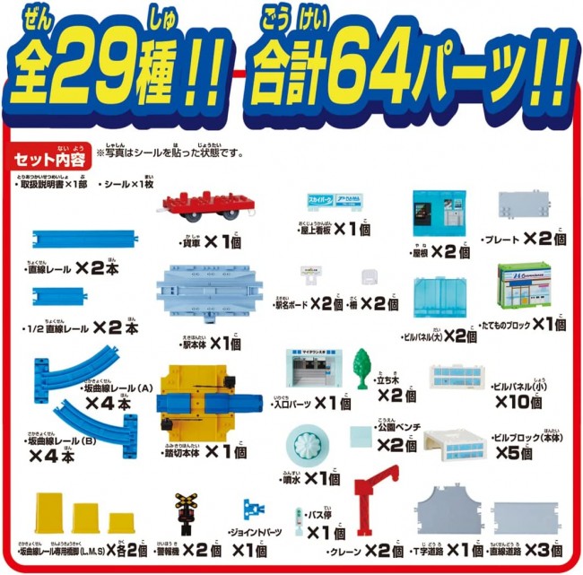 くみかえて自分だけのプラレールとトミカの街、プラレールがかっこよく走る街を作ろう! ・ビルブロック、屋根やパネル、アクセサリーパーツを組みかえて、様々なまちを作り、プラレール車両のかっこいいシーンを再現する事ができます。 ・付属の貨車に凸部(スタッド)があり、パーツを載せて運ぶことができます。 ・ビルブロック本体にビルパネル(小)を付けたビルブロックは、プラレールの橋脚として使用することができます。 ・付属の踏切は、直線レールに沿ってスライドできるので、道路に合わせやすくなっています。 ・まちクリエイターマークのついた商品と一部のパーツは互換性があり、組みかえて遊ぶことができます。 【セット内容】駅本体(1),屋根(2),ビルブロック本体(5),ビルパネル(小)(10),ビルパネル(大)(2),踏切(本体×1、踏切警報機×2)(1),入口パーツ、バス停 各(1),屋上看板、噴水 各(1),公園ベンチ(2),クレーン(2),駅名ボード、柵 各(2),立ち木(2),たてものブロック(1),プレート(2),坂曲線レール(A、B) 各(4),坂曲線レール専用橋脚(L,M,S) 各(2),直線レール(2),1/2直線レール(2),ジョイントパーツ(1),直線道路(3),T字道路(1),貨車(1),シール(1),取扱説明書(1) (c) TOMY