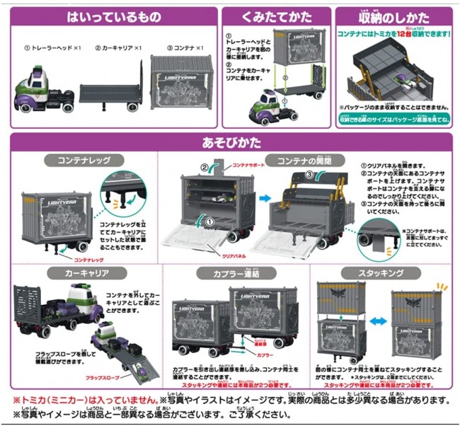 ディズニーモータースを12台運ぶことができるスターコマンドキャリーが映画『バズ・ライトイヤー』デザインになって新登場! ・サイドパネルには、映画『バズ・ライトイヤー』のキャラクターたちが集合。 ・コンテナにしまったモータースをいつでも眺めることができるので、キャリーの可愛らしさとモータースの可愛らしさの両方を楽しむことができます。 ・飾っていてもおしゃれなキャリーです。 ※トミカは付属しません 【セット内容】トレーラーヘッド(1),カーキャリア(1),コンテナ(1) (c) Disney/Pixar