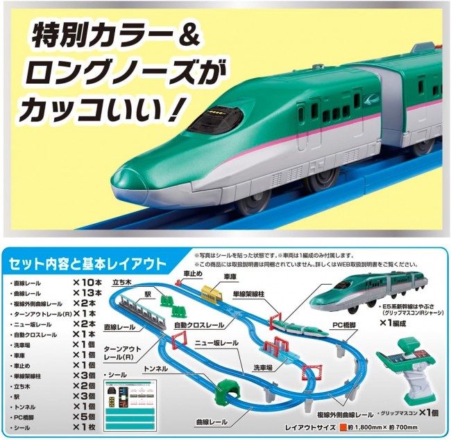 加速・減速、停車・バック、6段階のスピード調整! グリップマスコンでE5系新幹線はやぶさを自在にコントロール! コントロールあそびがより楽しくなる、大きなレイアウト付き! E5系新幹線はやぶさをグリップマスコンで簡単操作、自在にコントロール! 加速・減速、停車・バックなどリアルな走行を楽しもう!! ■特別カラー&ロングノーズのE5系新幹線はやぶさ車両(グリップマスコンIRシャーシ)、特別カラーのグリップマスコン付属 ■特別カラーの車庫や洗車場などコントロールあそびがより楽しくなるレール部品&情景部品付属 ■好きなプラレール車両(別売)にのせかえ可能※一部車両を除く ■グリップマスコンシリーズの車両が2台あればAとBのバンド切り替えで別々に走行させることが可能※セット内容に車両は1編成のみ付属します。 ※セット内容以外のレール、情景は別売です。 【セット内容】E5系新幹線はやぶさ(グリップマスコンIRシャーシ)(1),グリップマスコン(1),直線レール(10),曲線レール(13),複線外側曲線レール(2),ターンアウトレール(R)(1),ニュー坂レール(2),自動クロスレール(1),洗車場(1),車庫(1),車止め(1),単線架線柱(3),立ち木(2),駅(3),トンネル(1),PC橋脚(5),シール(1) (C) TOMY JR東日本商品化許諾済 コントローラー:単4形アルカリ乾電池2本使用(電池は別売です。) 車両本体:単3形アルカリ乾電池1本使用(電池は別売です。)