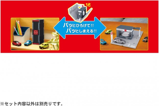 パッと開いてすぐに遊べるトミカタウンにNISSANカーディーラーが登場! 日産 スカイライン付き! 店舗内部にターンテーブルのあるカーディーラーです。 ダイヤルを手動で回すことでターンテーブルに飾ったトミカが回転し、ショールームのように遊ぶことができます。 組み立て、ラベル貼り不要で本体をパッと開くとすぐに遊べます。 また遊ばないときは折りたたんでコンパクトに収納が可能です。 ※セット内容以外のトミカは別売りです。 【セット内容】NISSAN カーディーラー(1),日産 スカイライン(1) (C) TOMY