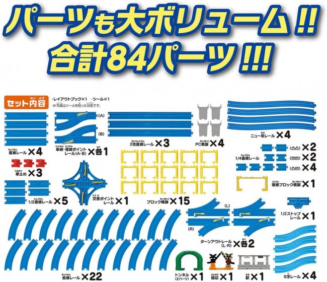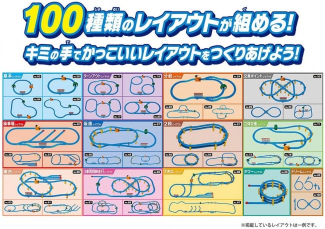 100種類のレイアウトが組める! 立体交差、3車両同時走行、タワーレイアウトなど、基本レイアウトから大きなレイアウトまで作ることができる大ボリュームのレールキット! タカラトミー100周年記念商品! レールや情景部品が全22種、合計84パーツの大ボリューム! 100種類のレイアウトを組むことができるレールキット! 特別カラーのS字レールが4本付属! 分かりやすいレイアウトブック付き! 13カテゴリー、100パターンを収録! 基本レイアウトから大きなレイアウトまで! ステップアップしながらいろんなレイアウトを作りあげよう! 【セット内容】直線レール(4),曲線レール(22),S字レール(4),1/2直線レール(5),1/2ストップレール(1),1/4直線レール(凸凸)(2),1/4直線レール(凹凹)(2),1/4直線レール(凸凹)(4),ターンアウトレールR(2),ターンアウトレールL(2),2倍直線レール(3),交差ポイントレール(1),ニュー坂レール(4),PC橋脚(4),ブロック橋脚(15),単線・複線ポイントレールA(1),単線・複線ポイントレールB(1),複線ブロック橋脚(1),車止め(3),駅(1),踏切(1),トンネル(1),レイアウトブック(1),シール(1) (C) TOMY