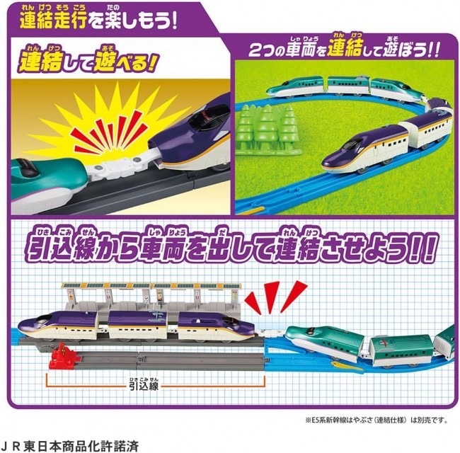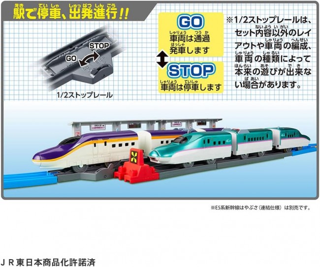 新型新幹線のE8系つばさが早くもプラレールに登場! E8系をより楽しめるトミカアーチ踏切や、新開発S字レールの限定カラーも付いたオールインワンセット! 車両は連結仕様なので別売のE5系新幹線と連結させて実際の編成を再現することもできる! さらに初回特典として限定カラーのS字レールが追加で3本付属! E8系つばさは2024年3月に運行開始予定で、新幹線・在来線規格を走行するJR東日本のミニ新幹線です。 E8系は在来線区間も走行するためトミカと遊べるアーチ踏切で実際のシーンを再現して遊べます。 新開発のS字レールは直線レールと同じ長さで複線幅間を移動でき、ゆるやかにカーブする走行シーンも楽しめます。 ■車両は「E8系山形新幹線つばさ」がモデル。 ■車両は連結仕様で他の連結仕様のプラレールと連結させて遊ぶことができ、2スピードで電動走行やスイッチOFFで手転がし遊びもできます。 ■アーチ踏切は遮断かんを手で動かして遊ぶことができ、トミカタウンのどうろともつなげて遊ぶことができます。 ■付属の駅では3両編成車両をかっこよく停めることができ、別売のプラキッズとも遊べます。 ■引込線には別のプラレール車両を停めて並列停車を楽しんだり、連結シーンの再現遊びができます。 ※セット内容以外は別売です。(E8系つばさ以外のプラレール車両、プラキッズ、レール、トミカ(ミニカー)、トミカタウンのどうろ) 【セット内容】E8系新幹線つばさ3両編成(連結仕様)(1),直線レール(1),直線レール(グレー)(2),1/2直線レール(1),1/2直線レール(グレー)(2),曲線レール(8),S字レール(限定カラー)(4),単線・複線ポイントレール(A)(1),1/2ストップレール(1),車両止め(1),新都会の駅(2),アーチ踏切(踏切ベース(1)、警報灯付きアーチ(2)、遮断かん(2))(1),トンネル(1),立ち木(黄緑)(1),立ち木(ピンク)(1),シール(1),部品注文書(1) (C) TOMY JR東日本商品化許諾済 単3形乾電池1本使用(電池は別売です。)
