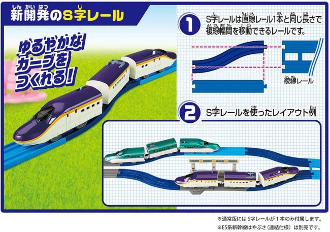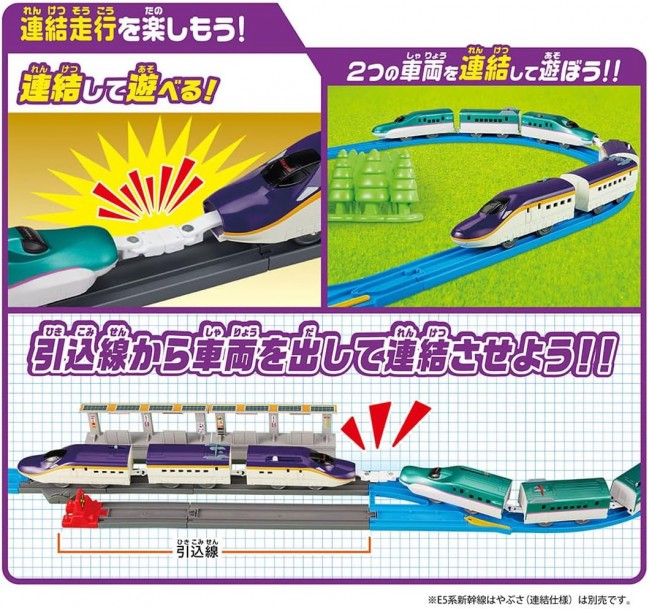 新型新幹線のE8系つばさが早くもプラレールに登場! E8系をより楽しめるトミカアーチ踏切や、S字レールの限定カラーも付いたオールインワンセット! 車両は連結仕様なので別売のE5系新幹線と連結させて実際の編成を再現することもできる! 2024年3月16日に運行が開始したE8系つばさは、新幹線・在来線規格を走行するJR東日本のミニ新幹線です。 E8系は在来線区間も走行するためトミカと遊べるアーチ踏切で実際のシーンを再現して遊べます。 S字レールは直線レールと同じ長さで複線幅間を移動でき、ゆるやかにカーブする走行シーンも楽しめます。 ■車両は「E8系山形新幹線つばさ」がモデル。 ■車両は連結仕様で他の連結仕様のプラレールと連結させて遊ぶことができ、2スピードで電動走行やスイッチOFFで手転がし遊びもできます。 ■アーチ踏切は遮断かんを手で動かして遊ぶことができ、トミカタウンのどうろともつなげて遊ぶことができます。 ■付属の駅では3両編成車両をかっこよく停めることができ、別売のプラキッズとも遊べます。 ■引込線には別のプラレール車両を停めて並列停車を楽しんだり、連結シーンの再現遊びができます。 ※セット内容以外は別売です。(E8系つばさ以外のプラレール車両、プラキッズ、レール、トミカ(ミニカー)、トミカタウンのどうろ) 【セット内容】E8系新幹線つばさ3両編成(連結仕様)(1),直線レール(1),直線レール(グレー)(2),1/2直線レール(1),1/2直線レール(グレー)(2),曲線レール(8),S字レール(限定カラー)(1),単線・複線ポイントレール(A)(1),1/2ストップレール(グレー)(1),車両止め(1),新都会の駅(2),アーチ踏切(踏切ベース(1)、警報灯付きアーチ(2)、遮断かん(2))(1),トンネル(1),立ち木(黄緑)(1),立ち木(ピンク)(1),シール(1),部品注文書(1) (C) TOMY JR東日本商品化許諾済 単3形乾電池1本使用(電池は別売です。)