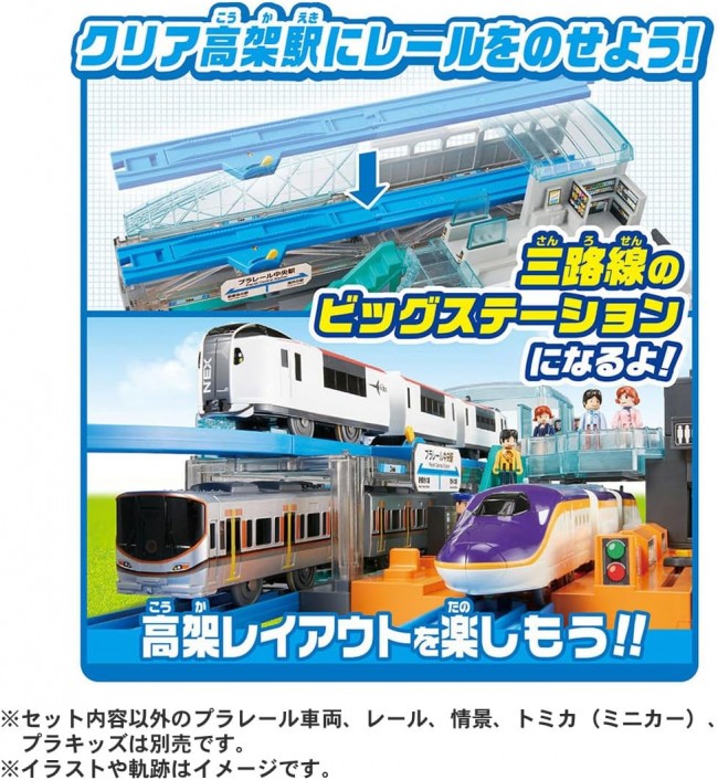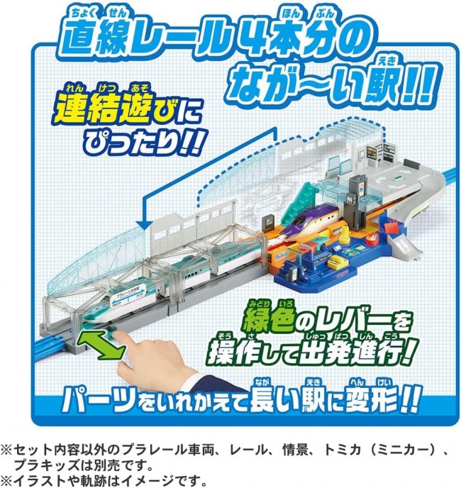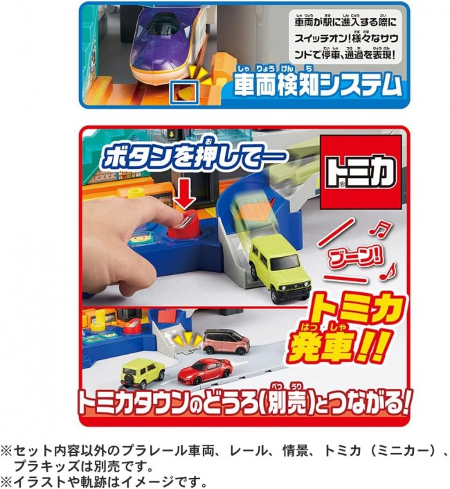 レバーとボタンでアクションが盛りだくさん!サウンド90種類以上搭載! 大きな駅でプラレールとトミカをコントロールできるレバステが登場! 長い駅に変形させて連結編成を楽しんだり、レールと情景を組み合わせて最大3編成でも遊べる! ■2線それぞれの停発車をレバーでコントロールできます。 ■パーツを入れかえて連結遊びが楽しめる長い駅に変形できます。 ■クリア高架駅にレールをのせると最大3編成で遊ぶことができます。 ■車両が侵入すると停車、通過など様々なサウンドが楽しめます。 ■駅員さんや発車メロディーなど3つのサウンドボタンを搭載。 ■ホームドアの開閉を操作できます。 ■顔認証改札機をイメージした改札でプラキッズ遊びができます。 ■ホームのプラキッズをレバーで動かすことができます。 ■エレベーターの昇降遊びとサウンドが楽しめます。 ■駅前ロータリーではトミカと遊べて、スロープではボタンを押すとトミカが発車しサウンドが連動します。 ■トミカタウンのどうろとつなげて遊べます。 ■プラキッズ1体付 ■Y字ポイントレール(A/B)各1本付 ※セット内容以外のプラレール車両、レール、トミカ(ミニカー)、プラキッズは別売です。 【セット内容】駅本体(1),クリア高架駅(ストップレール付き)(1),クリア高架駅(1),クリア高架駅 ジョイント(2),外壁プレート(クリア/グレー)(1),駅前ロータリー(1),クリア高架渡り廊下(1),スロープ道路(小/大)(1),車止め(1),クリアドーム(1),柱パーツ、柱パーツ(プレート付き)(1),階段(1),自動販売機(1),エレベーター、エレベーターレバー(1),直線レール(1),Y字ポイントレール(A/B)(1),プラキッズ(1),シール(1),取扱説明書(1) (C) TOMY 単4形アルカリ乾電池2本使用(電池は別売です。) ※電池はアルカリ乾電池をご使用ください。 ※誤飲防止のため、電池ケース蓋に「ネジ止め式」を採用しています。