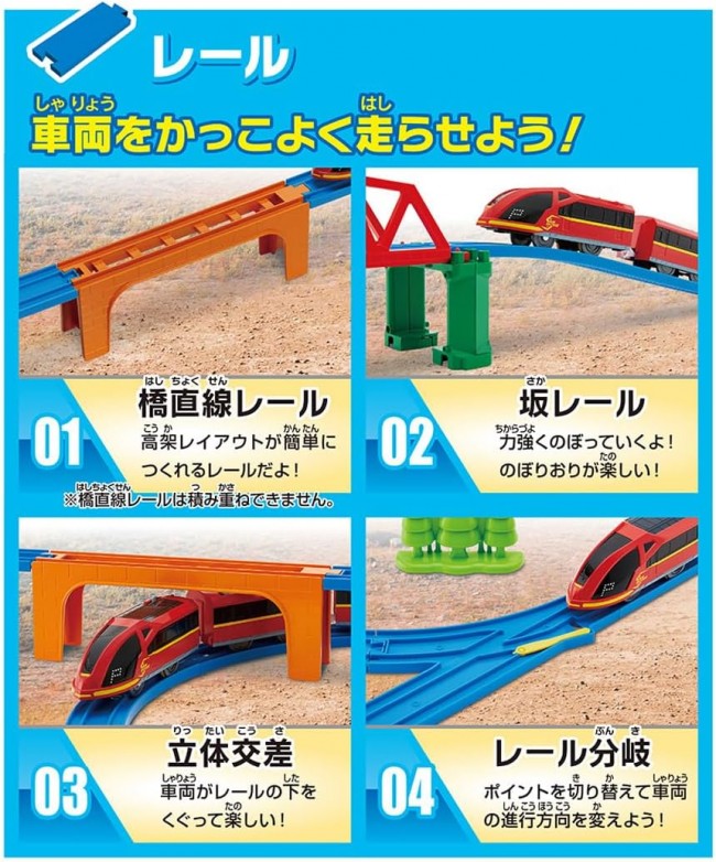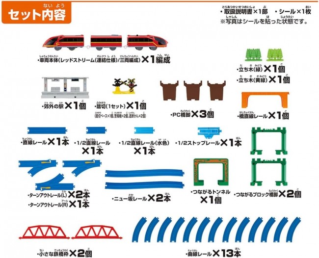 これからはじめるキミにぴったり!すぐに遊べる「車両」「レール」「情景」が揃っている! 連結遊びもできるオリジナル新車両と、組み合わせて遊べる新しいトンネルや橋脚、新レールも入った大ボリュームなオールインワンセット! 人気の「連結」遊びができるオリジナル新車両「レッドストリーム」や、新開発の「つながるトンネル」「つながるブロック橋脚」「橋直線レール」も入っている! 他にも人気のレイアウト「坂」「立体交差」「駅」「踏切」がこれひとつで遊べる! パーツは全18種類!このセットだけで5種類以上のレイアウトを組むことができます。 ■車両はオリジナル新車両「レッドストリーム」です。 別売の「ホワイトストリーム」や、「連結仕様」の車両と長編成にして遊ぶことができます。 ■「つながるトンネル」は「つながるブロック橋脚」と合わせて大きなトンネルや、高架のトンネルがつくれます。 ■「つながるブロック橋脚」は2つに分割できて、それぞれを1つの橋脚として使うこともできます。 ■「橋直線レール」は直線レールとブロック橋脚がひとつになった、高架を簡単につくれるレールです。 ※2024年12月までの限定生産の商品です。 【セット内容】車両本体(1),直線レール(1),1/2直線レール(1),1/2直線レール(水色)(1),曲線レール(13),1/2ストップレール(1),ニュー坂レール(2),ターンアウトレール(L)(2),ターンアウトレール(R)(1),小さな鉄橋枠(2),PC橋脚(3),郊外の駅(1),踏切(踏切ベース(1)、警報機(2)、遮断かん(2))(1),つながるトンネル(1),つながるブロック橋脚(2),橋直線レール(1),立ち木(緑)(1),立ち木(黄緑)(1),シール(1),取扱説明書(1),部品注文書(1) (C) TOMY 単3形乾電池1本使用(電池は別売です。) ※誤飲防止のため、電池ケース蓋に「ネジ止め式」を採用しています。