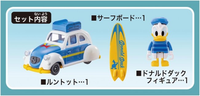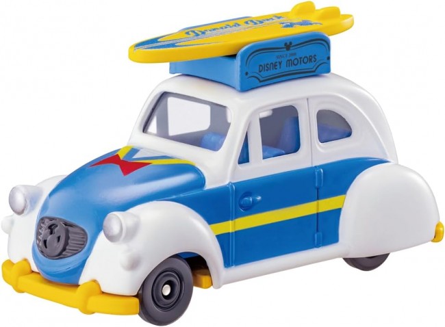 ドリームトミカから「ディズニーモータース ルントット ドナルドダック」が登場! ドナルドらしいカラーリングの、かわいらしくもクラシカルな雰囲気の車両"ルントット"です。 淡い色合いがサーフテーマにピッタリの一台です。 ボーダーTシャツを着たマリンテイストなドナルドフィギュア1体付き。 車両のルーフのサーフボードは取り外して、ドナルドの手に持たせることができます。 【セット内容】本体(1),ドナルドダックフィギュア(1),サーフボード(1) (C) Disney