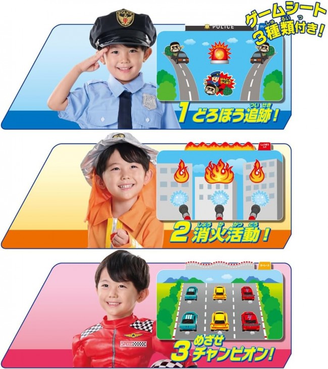 様々な運転体験ができるハンドルトイ! 3種類のゲームシートでいろいろなミッションに挑戦しよう! ハンドル操作で運転をして、様々なミッションにチャレンジしよう! 沢山のサウンドや音声で迫力のドライブ体験! 付属のゲームシートを差し替えて、3つのモードで遊べるよ。 ・どろぼう追跡モード ・消火活動モード ・チャンピオンモード 手持ちの好きなトミカを取り付けて遊ぶことができるよ。 ※セット内容以外のトミカ(ミニカー)は別売りです。 【セット内容】本体(1),ダミートミカ(1),ゲームシート(3),ラベル(1),車両ジョイントパーツ(1) の商品について (C) TOMY 単4形アルカリ乾電池3本使用(電池は別売です。) ※電池はアルカリ乾電池をご使用ください。 ※誤飲防止のため、電池ケース蓋に「ネジ止め式」を採用しています。